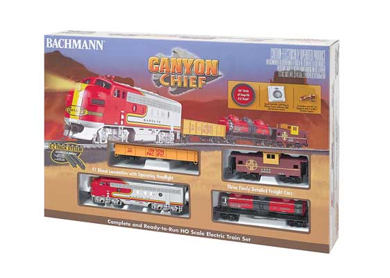Navigating with ease past the deep gorges and steep mesas of the Southwest landscape is the Canyon Chief. Commanded by a Santa Fe EMD F7 in the iconic war bonnet paint scheme, the unyielding Canyon Chief always delivers its freight load on time. Set includes an F7 diesel locomotive with operating headlight, 3-dome tank car, gondola and wide vision caboose plus a 36" E-Z Track(R) circle, power pack, speed controller and illustrated instruction manual.