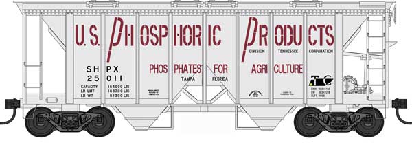 HO Scale Bowser Manufacturing Co. 70-Ton 2-Bay Covered Hopper with Open Sides US Phosphoric Products #25011