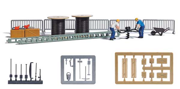 This Busch HO Scale Auger, 2 Figures and Telecomm Accessories Miniature Scene is perfect for creating a complete telecommunication work scene on your layout. The set includes two construction worker figures, steel masts, tools, toolboxes, wheelbarrows, barriers, chain saws, canisters, sand trays and cable drums. These items all work together in a scene but can also be split up and used for detailing multiple locations.