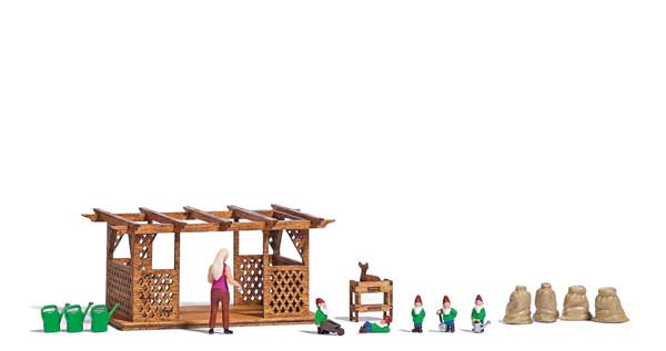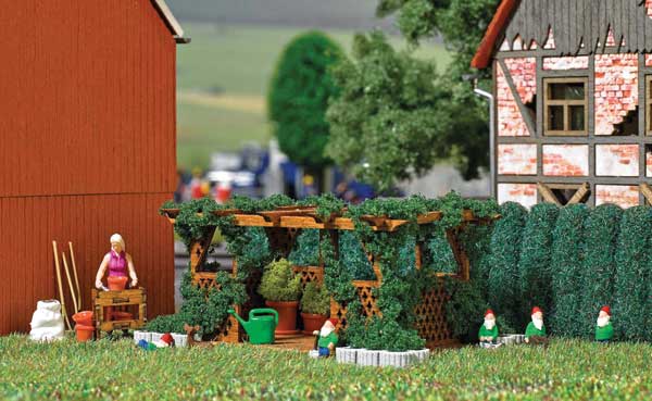 There's plenty going on in the Busch HO Scale Garden Miniature Scene. This detail set includes a laser-cut wood kit for a pergola, a lady gardener figure, garden cart, pots, planters, five garden gnomes, four sacks, three watering cans and various garden tools. All pieces in this miniature scene are molded in appropriate colors and the figures are handpainted. Add the complete gardening scene near homes on your train layout or diorama or split up the details and use them as details all along your model railroad's neighborhood scenes.