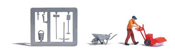 Keep diesel-era yards, parks and trails on your layout well swept with the Busch HO Scale Street Sweeper Miniature Scene. This detail set includes a man pushing a powered sweeper, wheelbarrow and various tools,. All pieces in this miniature scene are molded in appropriate colors and the figures are handpainted. Add the complete street sweeper scene to your train layout scene or split up the elements and use them as details all around your model railroad.