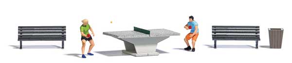The competition is heated in this Busch HO Scale Table Tennis - Ping Pong Miniature Scene. Great for any diesel-era layout or diorama, the set includes two players, a cast-concrete outdoor ping-pong table, two park benches and a garbage container. It's a great miniature scene for parks, college campuses or beach scenes on your train layout.