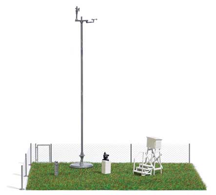 Keep track of the weather on your layout with the Busch HO Scale Weather Station Miniature Scene. This detail set includes a meteorological measuring tower, anemometer, wind gauge, weather hut with staircase, rain gauge, chain-link fence and 3-3/8 x 5-1/8" 10 x 13cm grass mat. Pieces in this scene are molded in appropriate colors. Use this set to add interest anywhere along your diesel-era model railroad.