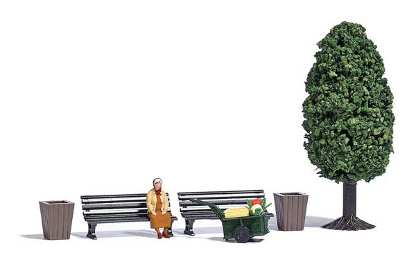 The Busch HO Scale Woman with Hand Cart Miniature Scene can be used on any diesel-era layout or diorama. The set includes a seated woman with a small two-wheeled handcart with load, two park benches, two garbage containers and a tree. The woman and hand cart and accessories in this miniature scene work well together or they can also be split up and used for detailing multiple locations.