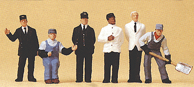 Perfect for adding life to your 1940s-1960s railroad's trains and platform scenes, the Preiser HO Scale US Railroad Transition-Era Passenger Train Crew includes six train crew employees; seated engineer and fireman with coal hod, conductor, trainman, porter and diner waiter-steward. Each set features injection-molded styrene figures molded in realistic poses. Figures are posed in realistic positions and are hand painted for extra realism. This US Railroad Transition-Era Passenger Train Crew is perfect for adding interest inside your passenger train on your North American-style steam-to-diesel transition-era layout.