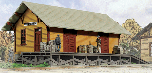 Modeling an authentic freight station scene is a snap when you add the Golden Valley Freight House to your layout. This fully assembled structure features detailed "wooden" siding, a loading dock and station name signs matching those included with the Golden Valley Depot. Its color scheme matches those of the Golden Valley Depot, Trackside Structures Sets, and Wood Water Tank, making it a perfect addition to your railroads trackside scenes.