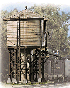 The Walthers Cornerstone Built-ups HO Scale Wood Water Tank is a typical wooden water tank based on those used on railroads from coast to coast. Constructed to satisfy steam locomotives' thirst for water, this fully assembled and decorated model adds instant steam-era realism to any layout. Appearing early in the 20th century, tanks like this were a fixture of railroad facilities until the last days of steam. It's perfect for busy engine terminals, small town yards and near smaller depots where engines were watered during the station stop. Fully assembled, the model features detailed wooden support timbers while the tank is molded in the same main color as other Trackside Built-up buildings. The spout on the Wood Water Tank can be moved to either the up or down position to add more action to any scene.
