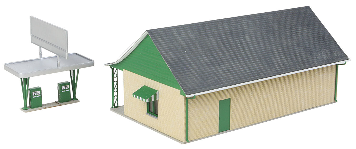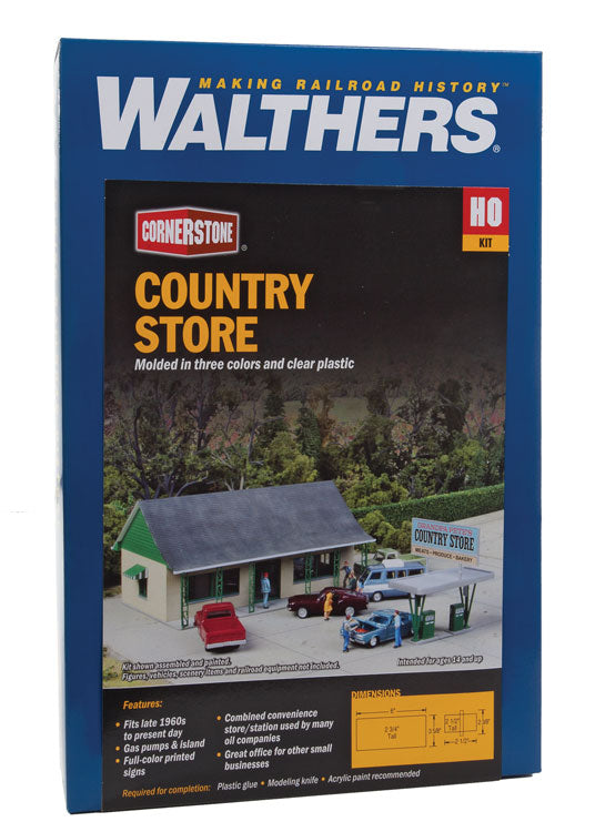 Need gas, beef jerky and a bag of chips? The Walthers Cornerstone Country Store is just the place! Based on gas station convenience stores that sell all kinds of products, it's perfect for roadside scenes on your layout. The kit features a main building with a curved pitched roof, gas pump island with a canopy and two pumps. Parts are molded in appropriate colors and full-color printed signs are included. The Country Store measures: Main Building: 6 x 3-5/8 x 2-3/4" 15.2 x 9.2 x 6.9cm; Gas Pump Island: 2-1/2 x 2-1/2 x 2-3/8" 6.3 x 6.3 x 6cm.