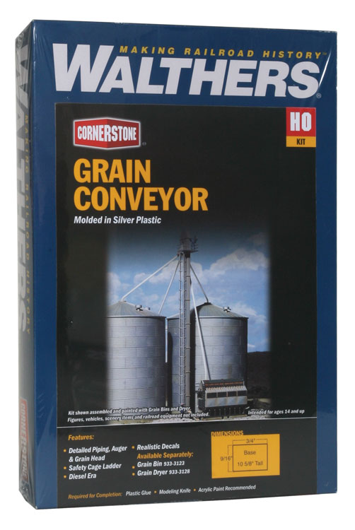 The Walthers Cornerstone HO Scale Grain Conveyor is an ideal addition to any diesel-era grain elevator or feed mill scene. Conveyor "legs," or elevators, lift wet and dry grain using an endless bucket conveyor. At the top, the funnel-shaped distribution head routes grain into the proper pipe, sending it cascading into storage bins, surge bin, covered hopper or grain truck. A typical grain operation has two or more legs, with at least one each dedicated to incoming wet or outbound dry grain.