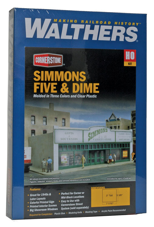The Walthers Cornerstone Simmons Five and Dime kit is based on typical small, single-story businesses that were constructed in rapidly developing suburban neighborhoods beginning in the 1950s. Featuring a brick structure with large display windows, this kit is typical of small stores and specialty shops still used on Main Street or in suburban business districts. This easy-to-build plastic kit comes molded in appropriate base colors plus clear window glazing and includes a printed interior and printed signs. Simmons Five and Dime is just one of many Cornerstone HO Scale businesses