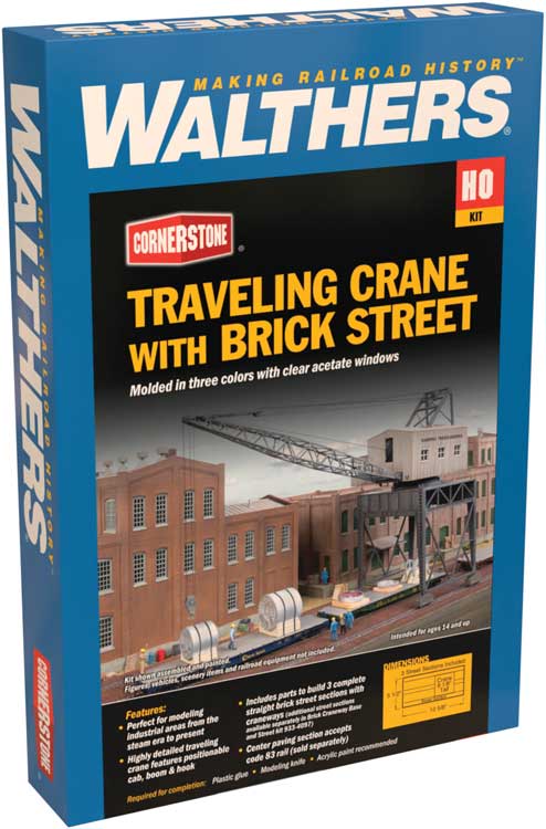 From the waterfront to heavy industries, Traveling Cranes like this HO Cornerstone kit have been a fixture of city skylines for decades. This model makes it easy to add both the crane and authentic brick paving to your industrial areas from the steam-era to the present day. Features include: