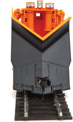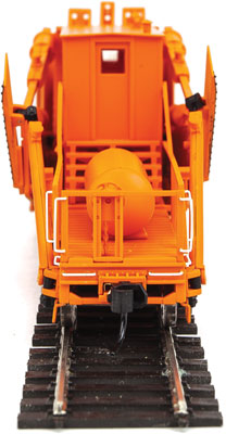 Painted in typical modern maintenance colors, this WalthersProto Jordan Spreader is complete with horizontal air tank, a modern horizontal headlight at each edge of the wing post crosstie with a third vertical light in the center, plus an air horn mounted at the right front of the cab.
