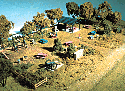 Includes: Shelter House, basswood fence, nine trees (with two colors of Foliage), four colors of grass and soil, two colors of Foliage for bushes and weeds, and over 40 white metal castings including bar-b-q ovens, tire swing, teeter-totter, picnic tables, people, trash cans and park swing.