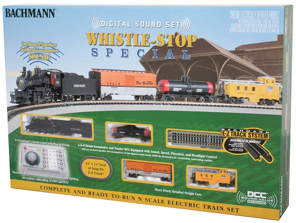 The Bachmann N Scale Whistle Stop Special literally has all the bells and whistles you need for realistic train fun! A 4-6-0 Ten Wheeler equipped with a Sound Value DCC and sound system pulls a 40' boxcar, single-dome tank car and steel caboose on a 34 x 24" E-Z Track oval. You'll have fun using the E-Z Command(R) Control Center to blow the whistle and ring the bell as the steam engine runs down the track. Featuring realistic sounds such the chuff, air compressor, blower in 16-bit digital sound, the Sound Value package is great for beginning and advanced modelers alike! All cars feature body-mounted E-Z Mate(R) knuckle couplers and the set comes with a complete illustrated instruction manual.