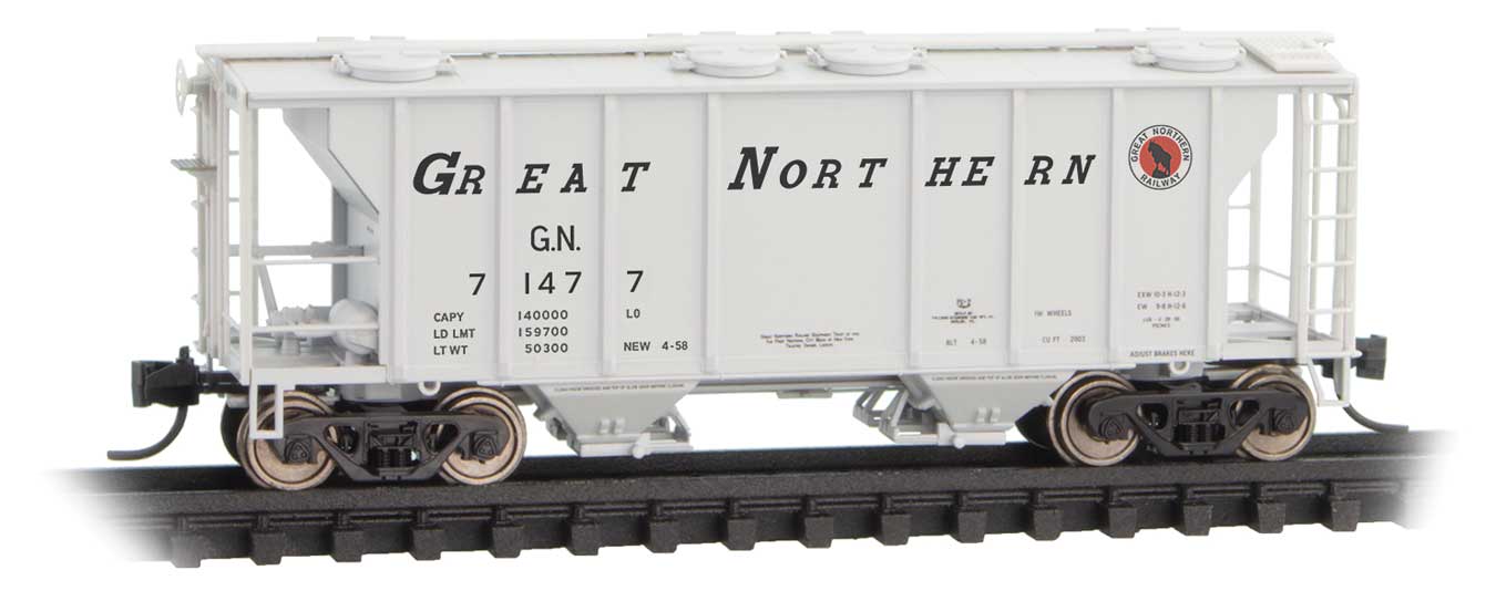 This ready-to-run N Scale Pullman-Standard PS-2 2-Bay Covered Hopper from Micro-Trains is perfect for your transition and classic diesel-era layout. During the mid-1950's, Pullman-Standard developed a revolutionary all-welded steel, 2,003 cubic-foot two-bay covered hopper that would become one of the most popular cars of its type with railroads and private industry. The PS-2 had a dividing wall inside so multiple products could be carried at the same time and its eight round hatches allowed for quick, efficient loading. It was designed to haul everything from powdered chemicals, to grains, to construction materials such as sand or cement. Versatile and durable, this car continued in revenue service into the early 2000's, and is still sometimes found in maintenance-of-way service. This detailed model features separate roof hatches, a fine-scale cored-through plastic walkway, 33" factory-installed metal wheels, proper ride height, body-mounted Magne-Matic(R) couplers with blackened trip pins, and fine decoration.